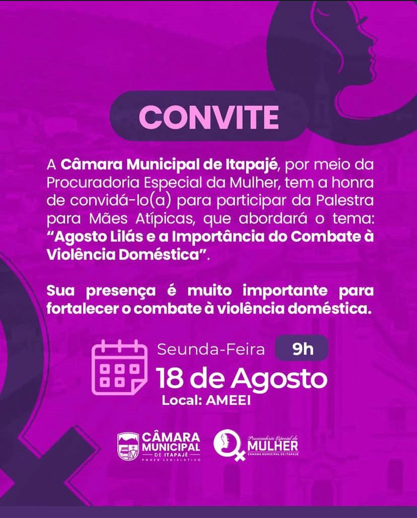 A Câmara Municipal de Itapajé, por meio da Procuradoria Especial da Mulher, convida toda a população para a Palestra para Mães Atípicas, com o tema: “Agosto Lilás e a Importância do Combate à Violência Doméstica” O evento acontecerá nesta segunda-feira, 18 de agosto, às 9h, no AMEEI • Sua presença é fundamental para fortalecer as ações de combate à violência doméstica e promover a conscientização na comunidade