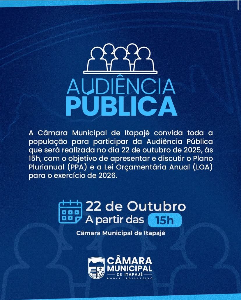 A Câmara Municipal de Itapajé convida toda a população para participar da Audiência Pública que será realizada no dia 22 de outubro de 2025, às 15h, com o objetivo de apresentar e discutir o Plano Plurianual (PPA) e a Lei Orçamentária Anual