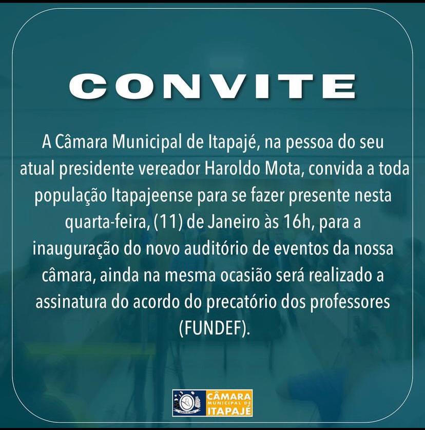 PRESIDENTE HAROLDO MOTA CONVIDA TODA A POPULAÇÃO PARA A INAUGURAÇÃO DO NOVO AUDITÓRIO Posted on 11 de janeiro, 2023 | by Gabriel Martins | Leave a Comment on PRESIDENTE HAROLDO MOTA CONVIDA TODA A POPULAÇÃO PARA A INAUGURAÇÃO DO NOVO AUDITÓRIO